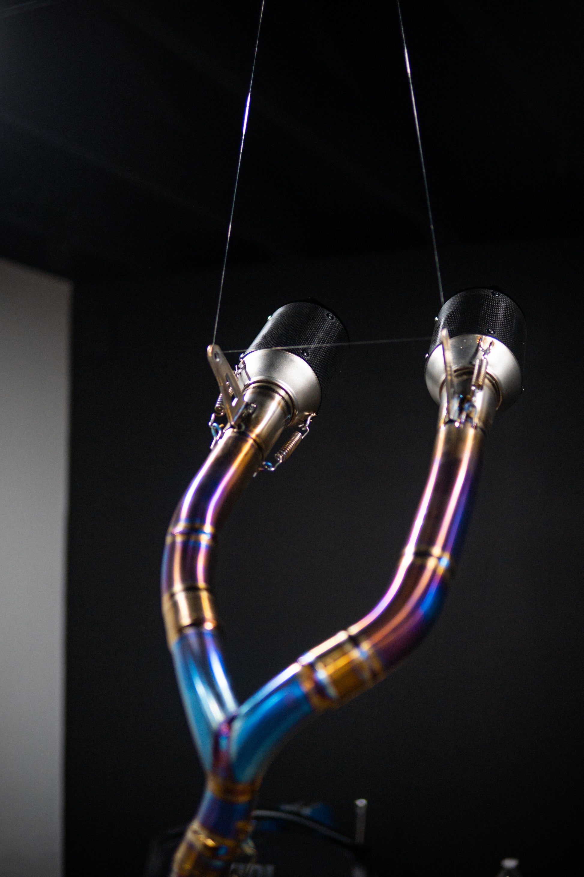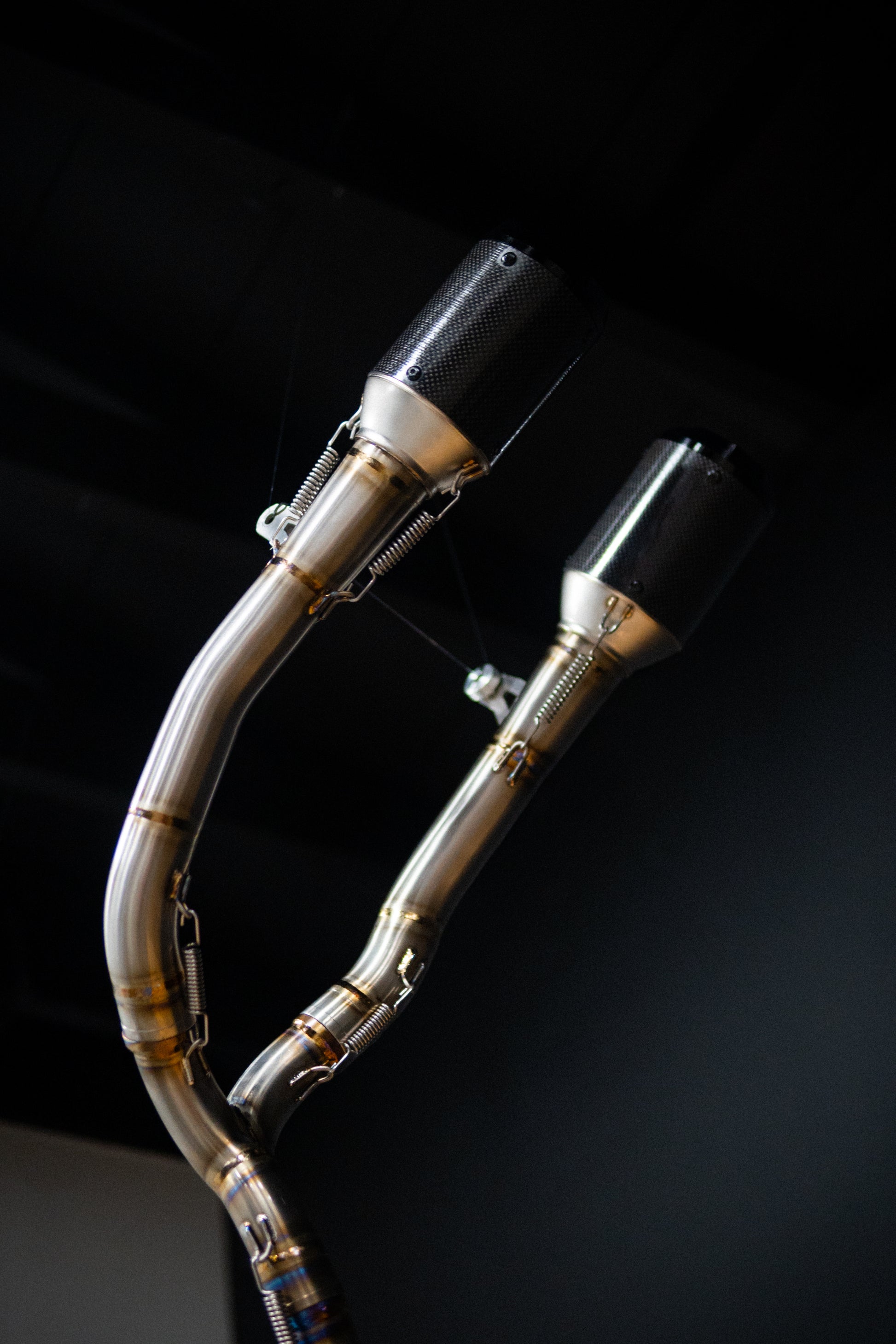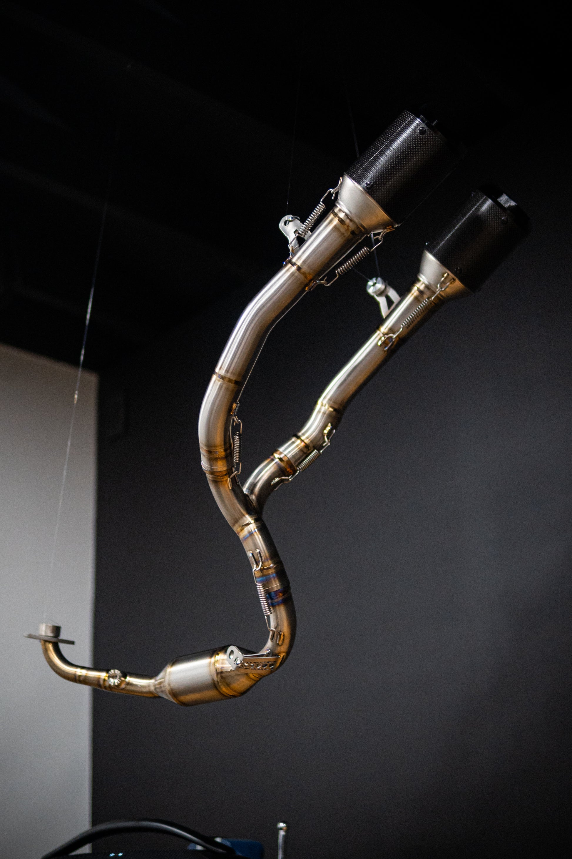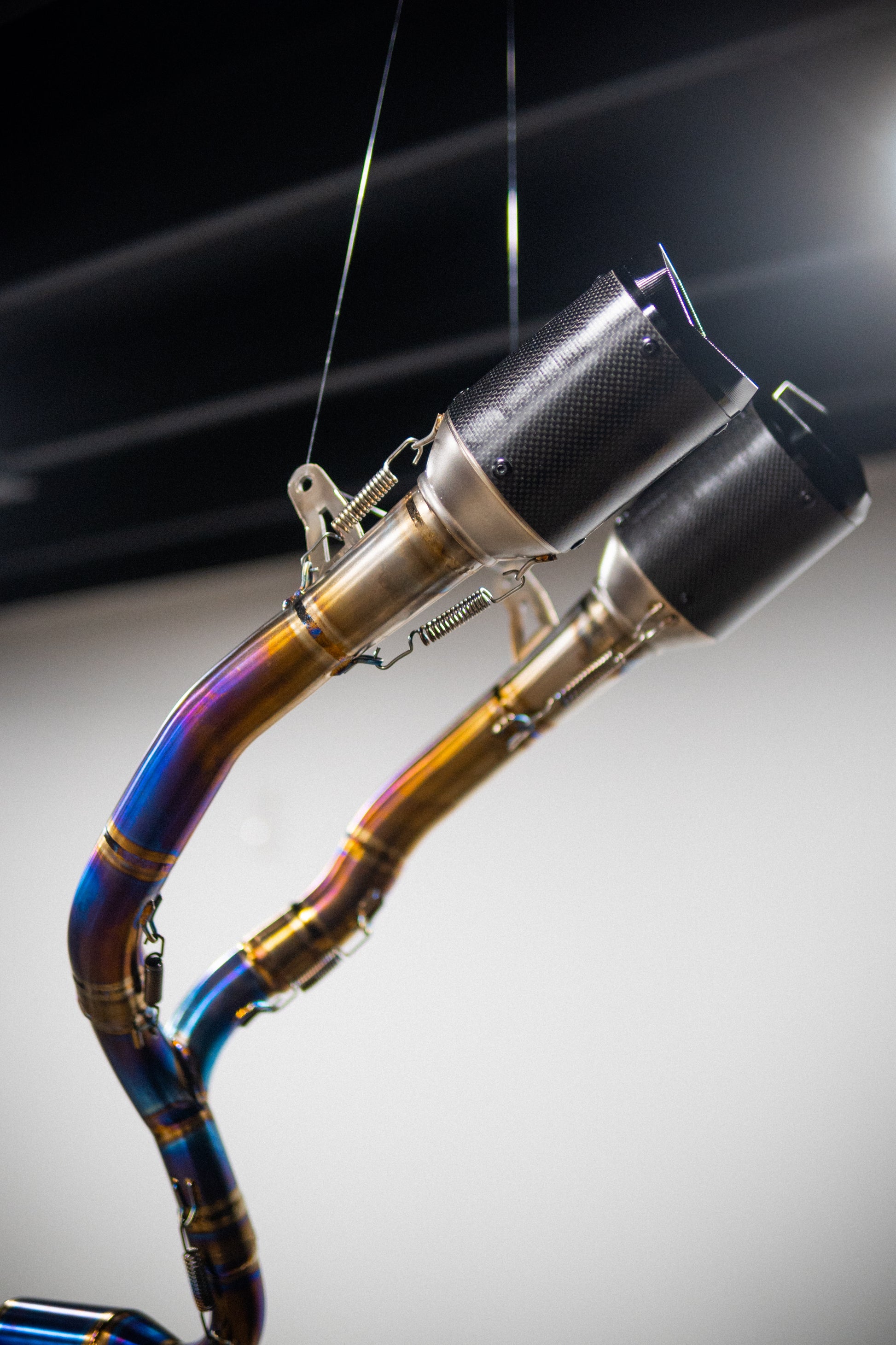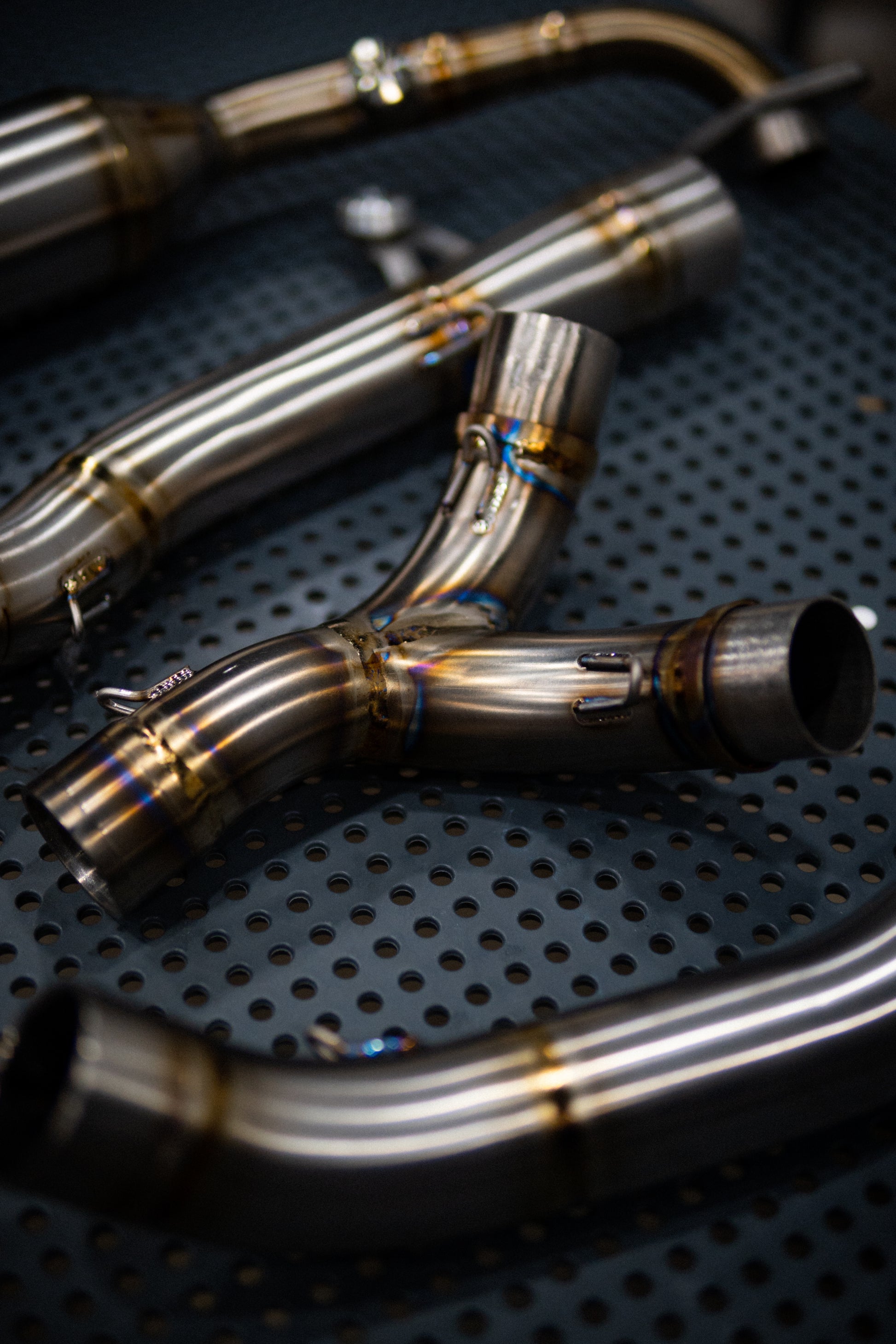 Crafted in-house from premium-grade titanium and featuring beautiful hand-welds, our beautiful system is designed to seamlessly follow the lines of your bike—looking as if it came straight from the factory. This system features dual 50mm aftermarket exhaust silencers optimizing airflow for increased power compared to OEM exhaust. Despite the larger outlet diameter, we've incorporated a compact resonator filled with high-quality woven fiberglass to simulate back pressure, ensuring you don't lose any torque.