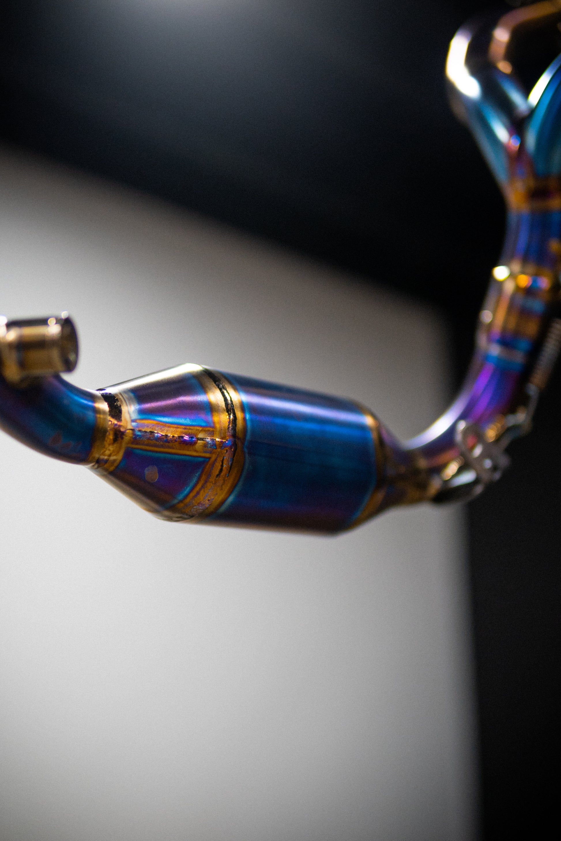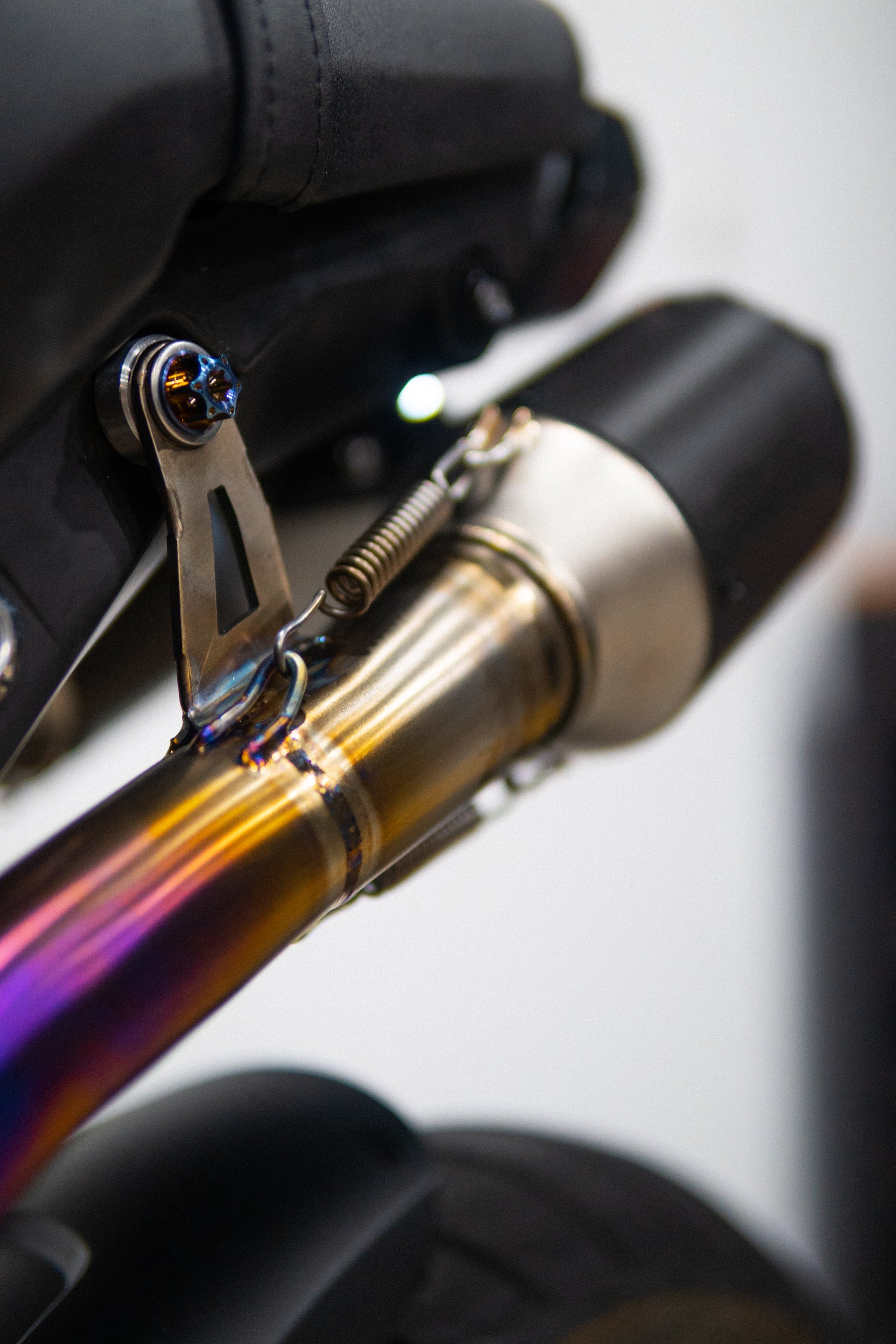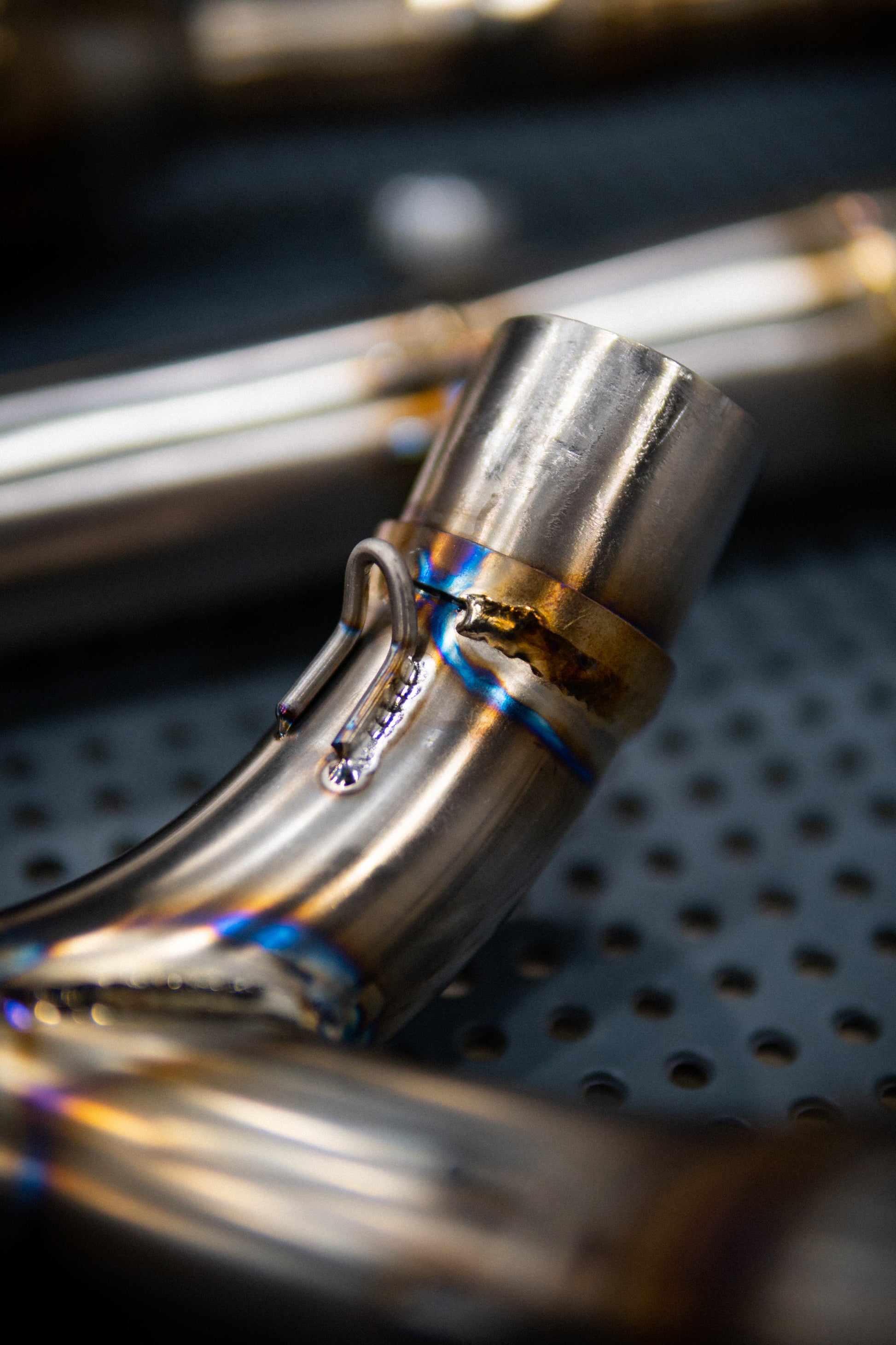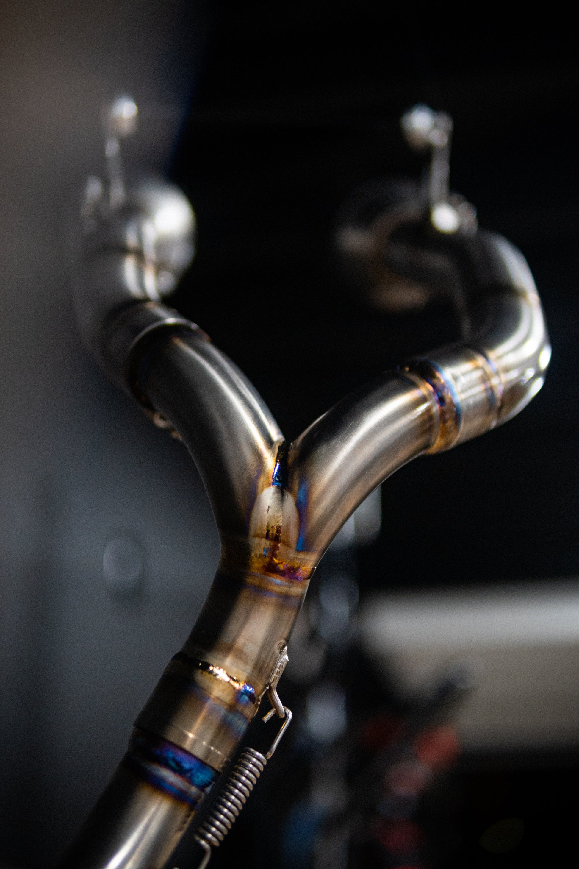 Crafted in-house from premium-grade titanium and featuring beautiful hand-welds, our beautiful system is designed to seamlessly follow the lines of your bike—looking as if it came straight from the factory. This system features dual 50mm aftermarket exhaust silencers optimizing airflow for increased power compared to OEM exhaust. Despite the larger outlet diameter, we've incorporated a compact resonator filled with high-quality woven fiberglass to simulate back pressure, ensuring you don't lose any torque.