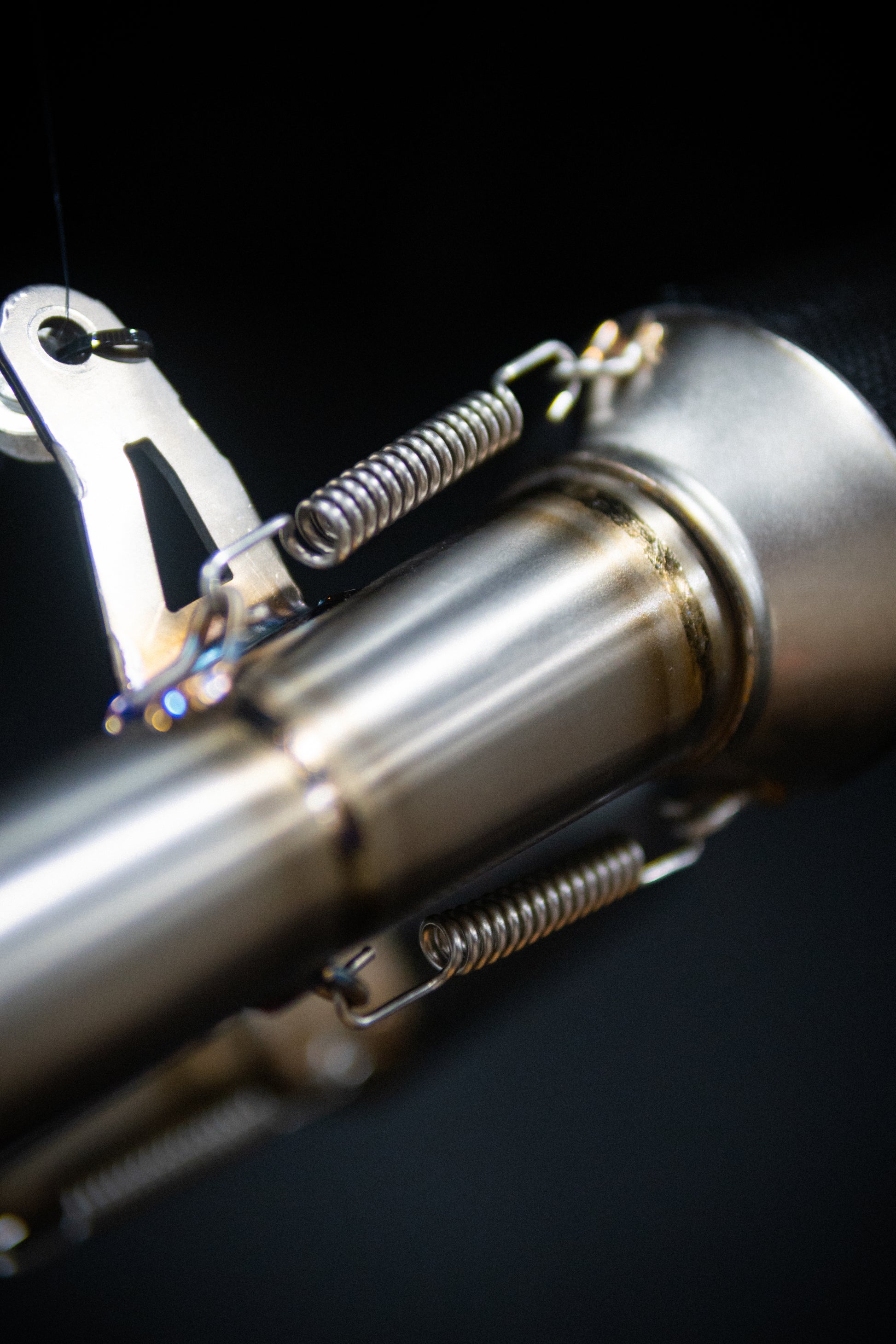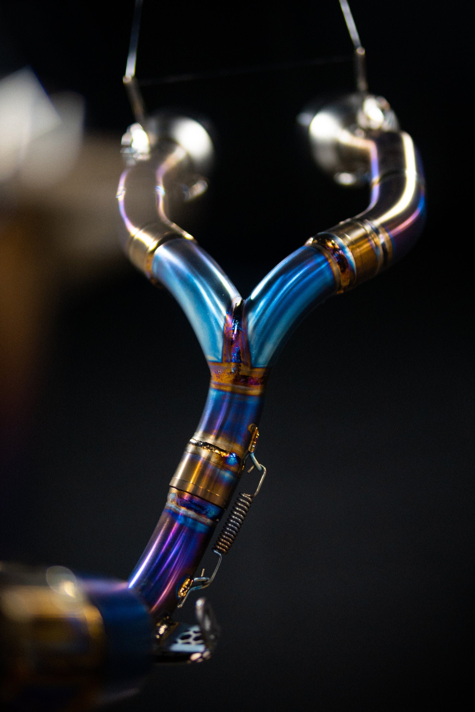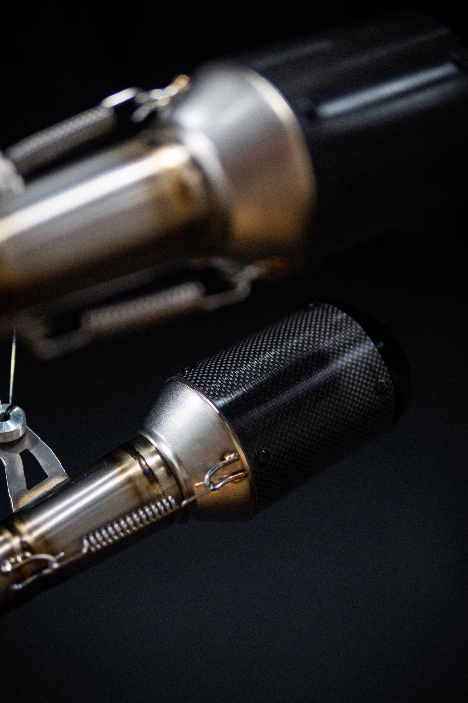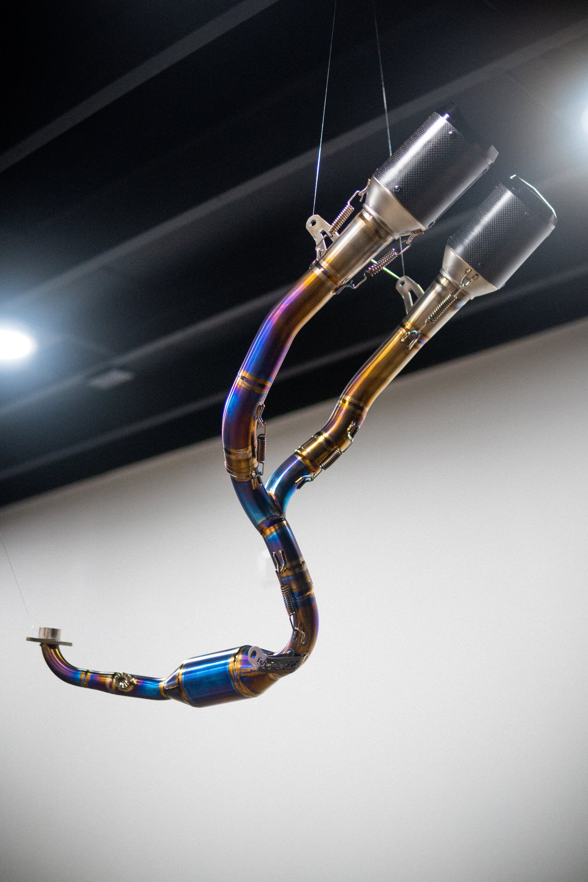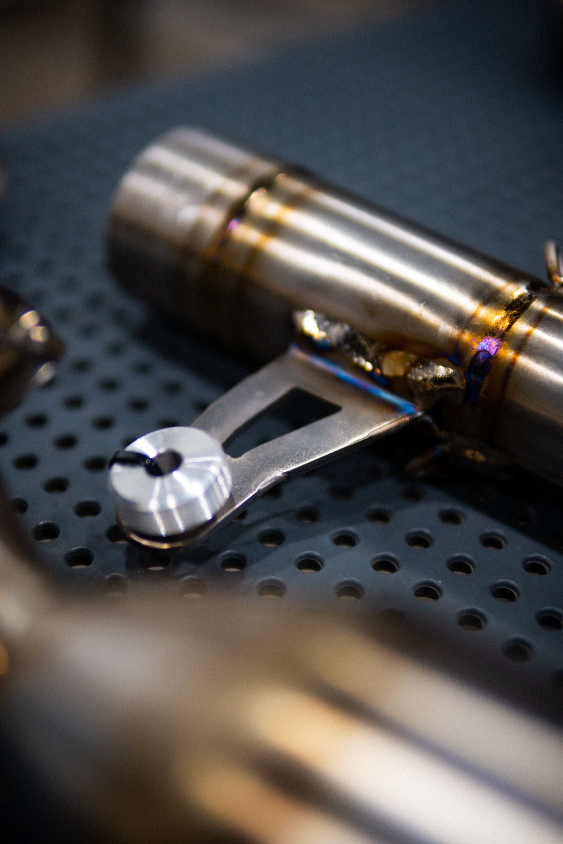 Crafted in-house from premium-grade titanium and featuring beautiful hand-welds, our beautiful system is designed to seamlessly follow the lines of your bike—looking as if it came straight from the factory. This system features dual 50mm aftermarket exhaust silencers optimizing airflow for increased power compared to OEM exhaust. Despite the larger outlet diameter, we've incorporated a compact resonator filled with high-quality woven fiberglass to simulate back pressure, ensuring you don't lose any torque.
