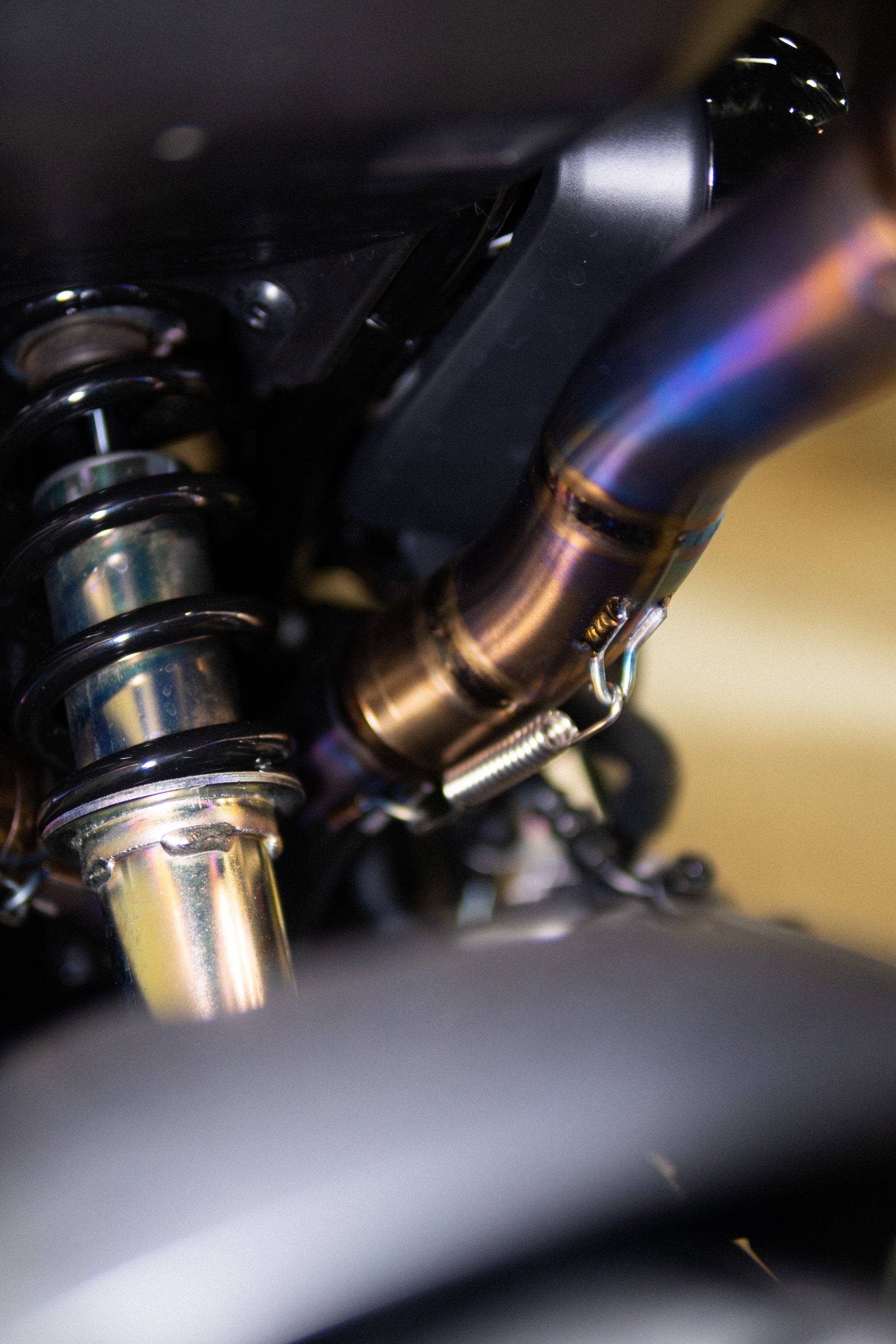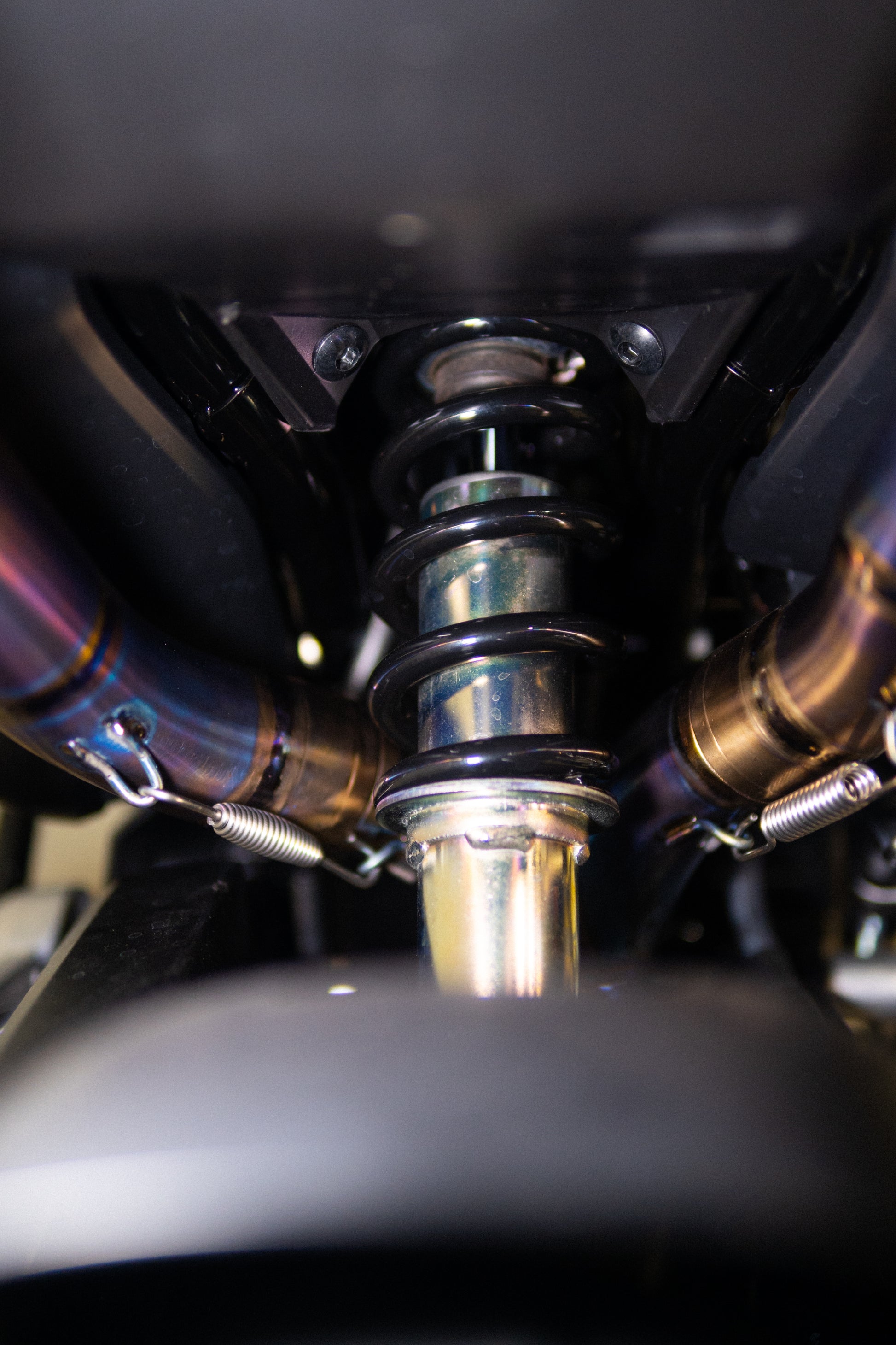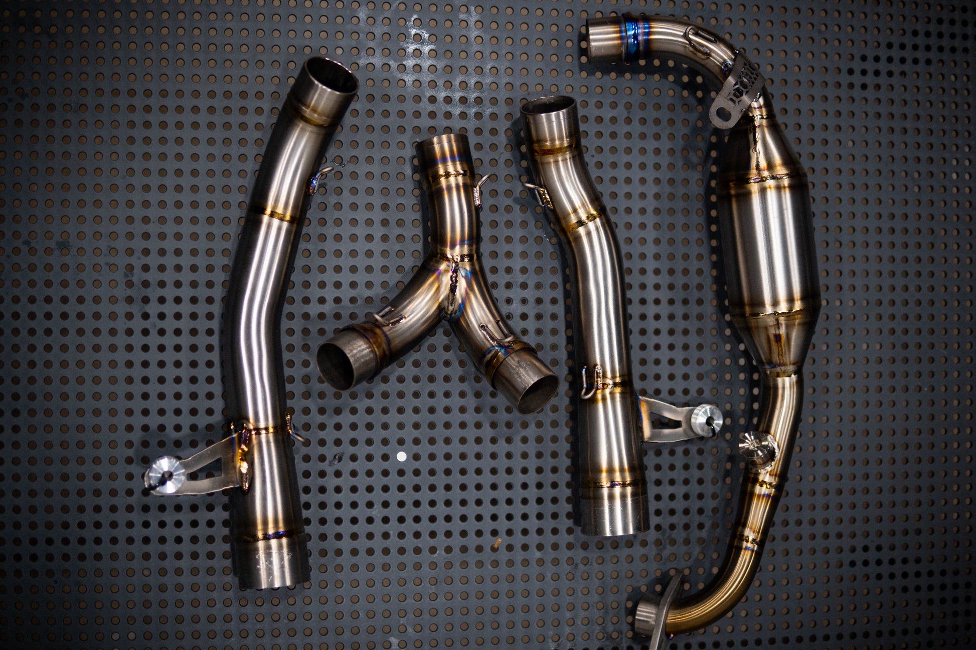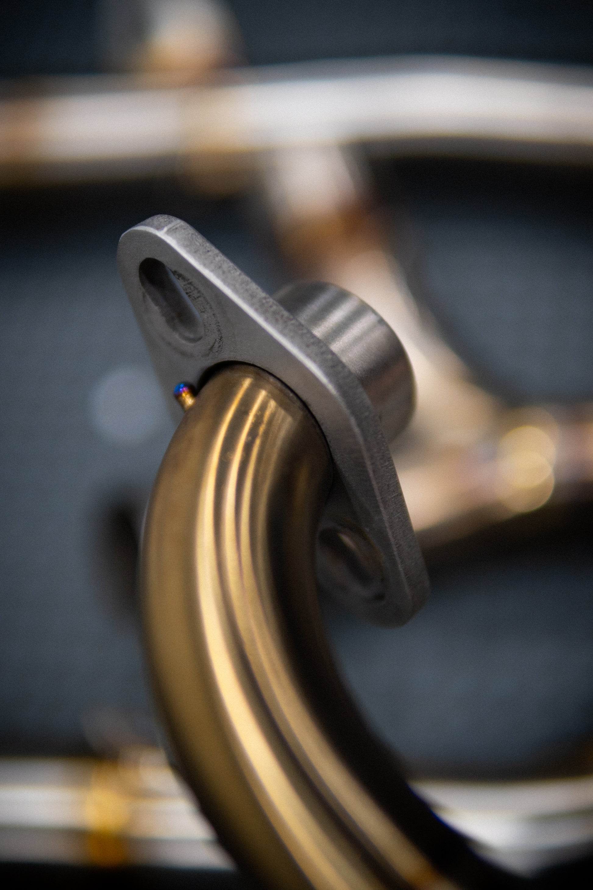 Crafted in-house from premium-grade titanium and featuring beautiful hand-welds, our beautiful system is designed to seamlessly follow the lines of your bike—looking as if it came straight from the factory. This system features dual 50mm aftermarket exhaust silencers optimizing airflow for increased power compared to OEM exhaust. Despite the larger outlet diameter, we've incorporated a compact resonator filled with high-quality woven fiberglass to simulate back pressure, ensuring you don't lose any torque.