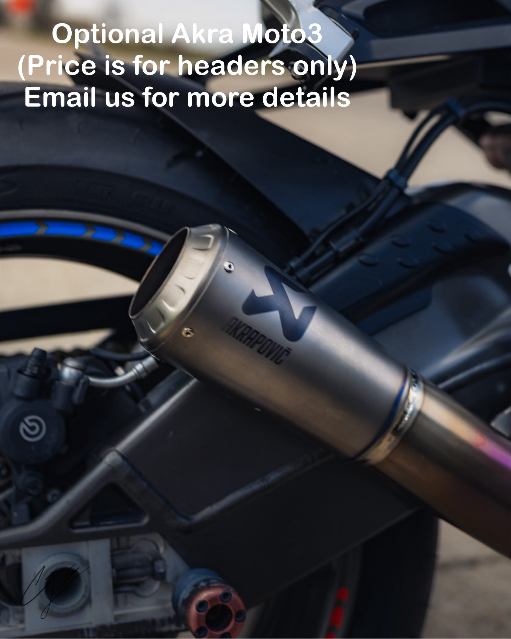 We also offer some limited Akra Moto3 exhaust for additional charge. Price ranges from $900 - $1,400 depending on condition. (These are genuine race-used exhaust from Moto3 race bikes)